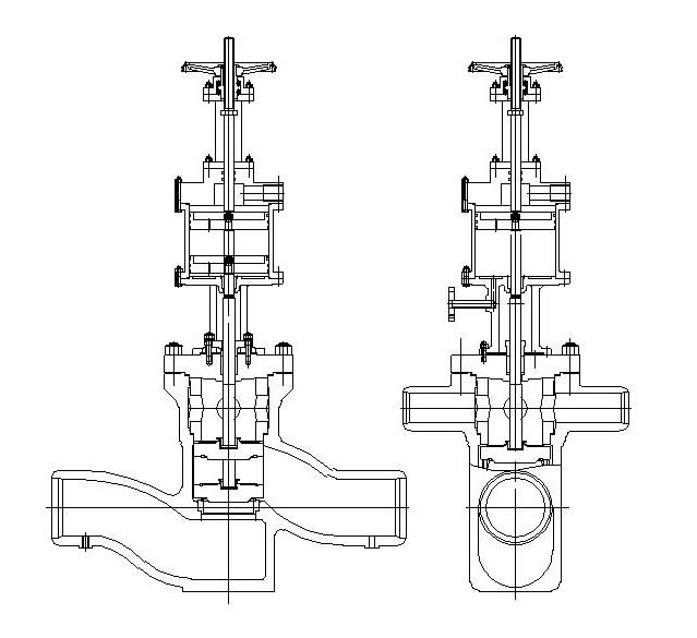 该阀为液控四通阀,给水由侧面进口引入,向下出口进高压加热器,阀上方有两个出口与旁通管路相连。阀门有上下两个密封面,高加正常运行时,靠作用于阀瓣截面的压差使阀门自动开启,阀瓣上移,与上密封接触,旁路切断。当高压加热器发生事故管系破裂而使水位超过允许水位时,水位信号通过电器装置打开快速启闭阀,凝结水进入液压缸上部,推动活塞,阀瓣下移进而快速关闭阀门,给水通过上面两旁通管道直接进入锅炉,使高加解列,保护机组安全运行。该阀有两个阀座,密封面堆焊司太立(Stellite)合金,下阀座直接焊于阀体上,上阀座与阀体采用双道自密封结构,保证阀门正常工作和长期运行不发生泄露,阀门动作时间2秒。该阀和出口阀(手动止回阀)配套,确保高压加热器安全运行。根据系统要求,该四通阀也可采用电动控制,由事故信号反馈,通过阀门上部的电动装置,驱动阀门动作,实现保护高加的功能。3. 利用三台电动阀门组合实现高加保护:系统正常工作时,关闭旁路阀门,打开高加进、出口阀,给水通过高压加热器至锅炉,当高加出现故障时,打开旁通阀,关闭高加进、出口阀,使高加解列,给水经旁路直接进入锅炉,完成对高加的保护,保障整个机组的正常运行。